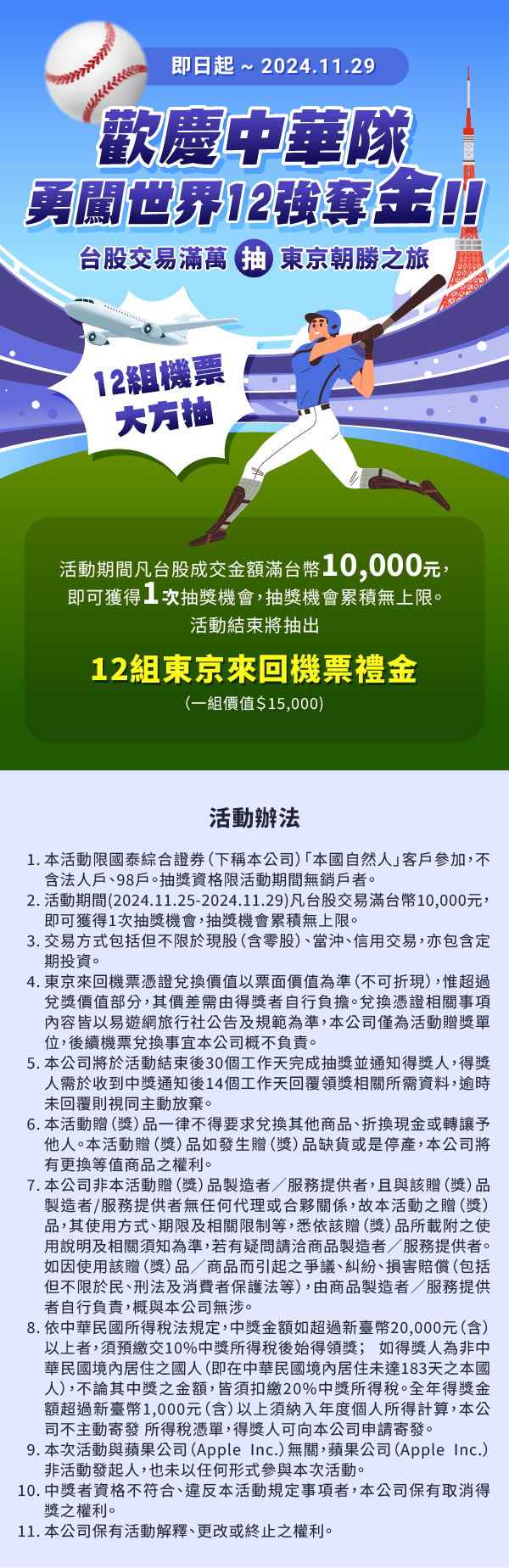 活動期間凡台股成交金額滿台幣10000元,即可獲得1次抽獎機會,累積無上限。