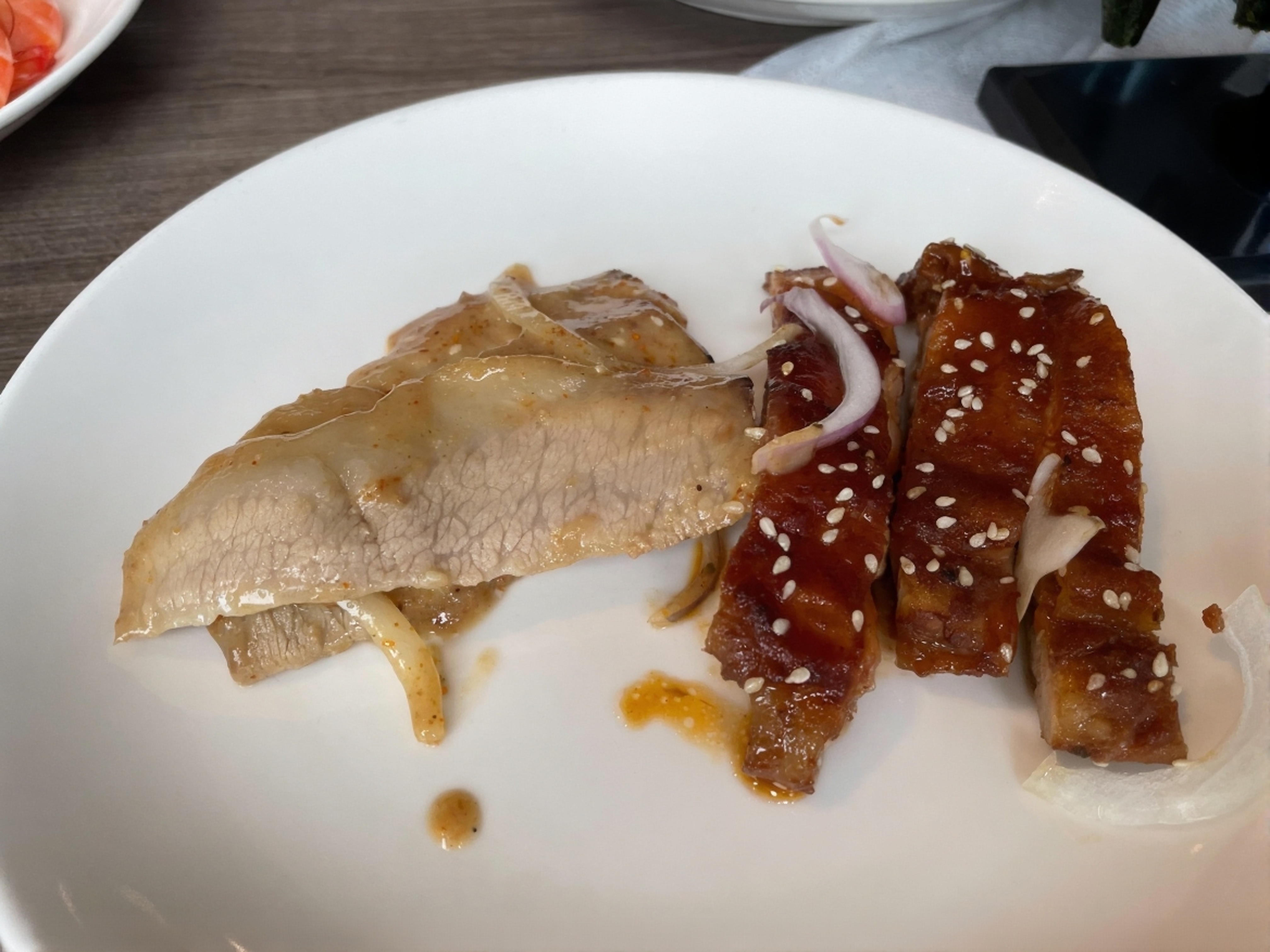 百宴的海鮮區選擇不算少,當天嘗了清蒸螃蟹和白灼蝦,各吃了兩盤。清蒸螃蟹主打原味,能嘗到蟹肉本身的鮮味,不算難吃但也毫無驚艷,屬於中規中矩的水準;白灼蝦的鮮甜感很足,直接吃就能品到蝦肉的清甜,搭配醬料吃風味會更豐富,是海鮮區裡表現還不錯的品項。另外還嘗了料理過的生蠔,口感和味道都挺不錯,可惜供應數量不多,想吃的話得趁早取餐。