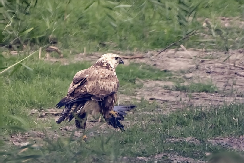 原來,大鵟是發現了獵物才主動飛襲!它那猛禽特有的犀利雙眼,遠遠就鎖定了目標紅鳩,一舉撲獲後,這隻紅鳩便成了鷹下亡魂。不過有趣的是,這位遠道而來的「貴賓」還上演了小插曲 —— 隨意排泄,好在台灣鳥友向來好客,念在它稀有珍貴,也只能一笑置之。最終,大鵟拖著獵物飛入草叢中大快朵頤,據說吃完一整隻紅鳩需要耗費不少時間。而這場飛行獵捕的畫面,還是大鵟出現以來的首次記錄,我雖對拍攝效果不算完美,但也已然滿足,不少鳥友在捕捉到這一珍稀瞬間後,也紛紛功成身退,轉往其他鳥點繼續拍攝。