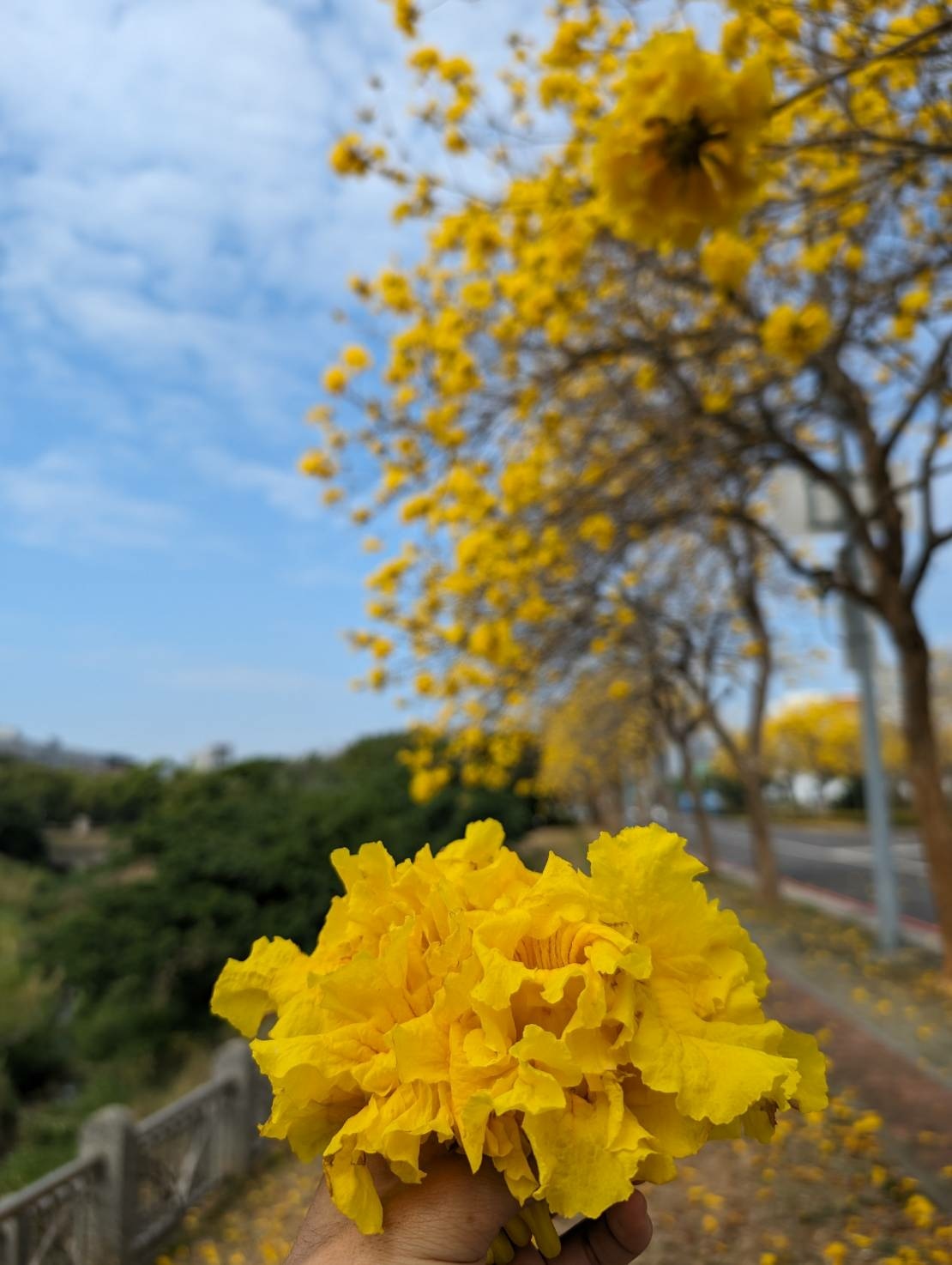 這裡的拍照出片率超高:藍天作為背景,金黃的花朵格外耀眼,不管是仰拍枝頭繁花、側拍步道全景,還是蹲拍花瓣地毯,都能輕鬆拍出絕美照片;還可以收集地上的黃花,製作成小巧的黃花捧花,拿在手上拍照,氛圍感直接拉滿;帶上玩偶、書籍等小道具,讓它們被黃花環繞,畫面更顯可愛溫馨。