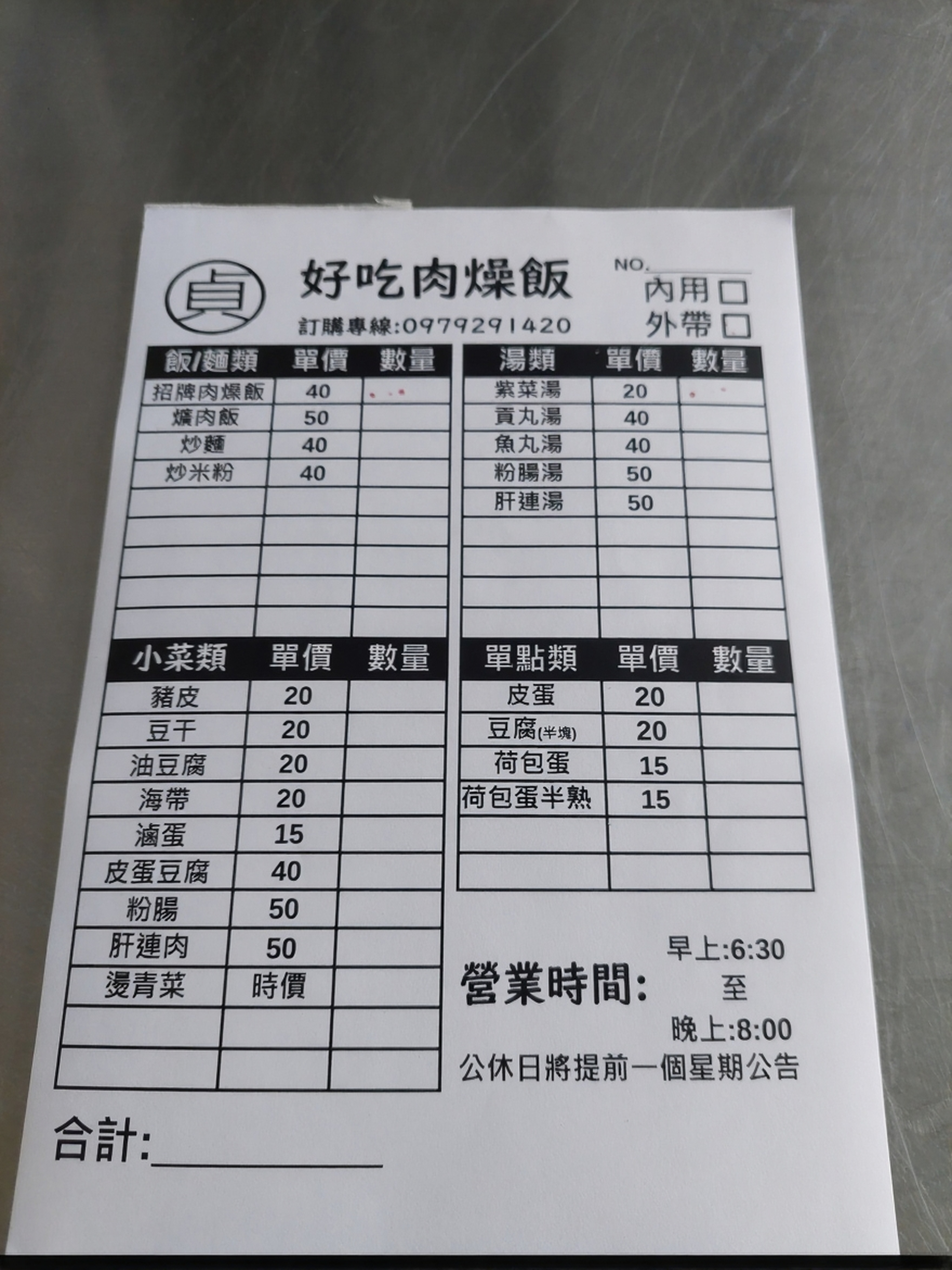 店內座位只有3 個,用餐時段幾乎客滿,外帶人潮更是不斷。空間結合工業風,擺有魚缸與鹿角蕨,簡單乾淨又有質感。內用先畫單再給老闆,餐點選項不多,但樣樣是經典古早味。