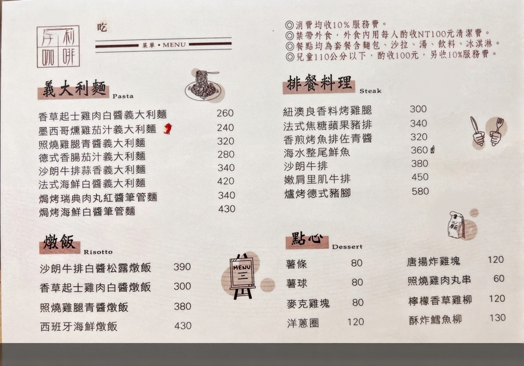 摩莉咖啡不只是咖啡廳,正餐選項超豐富:飯、麵、雞豬魚牛排餐通通有,套餐還附麵包、沙拉、飲料、冰淇淋,CP 值很高,全家大小都適合。