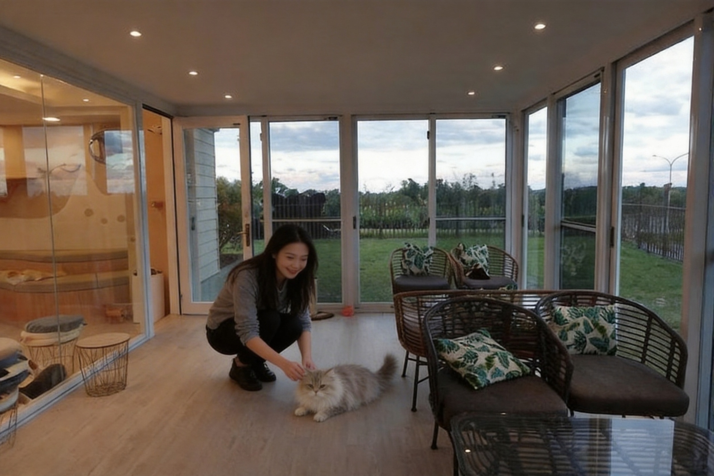 深處布置舒適,落地窗設計、有一點綠地感(但旁邊仍有工人施工,未完全完成)。