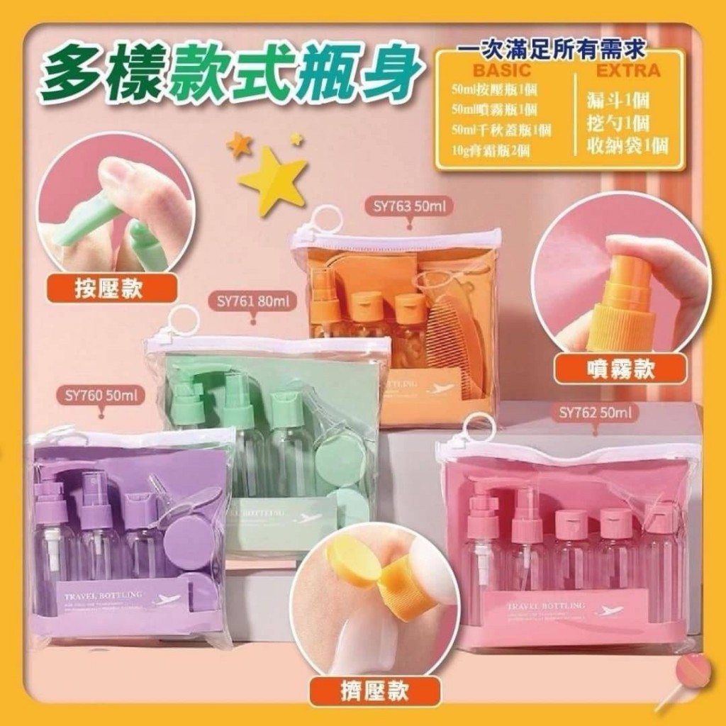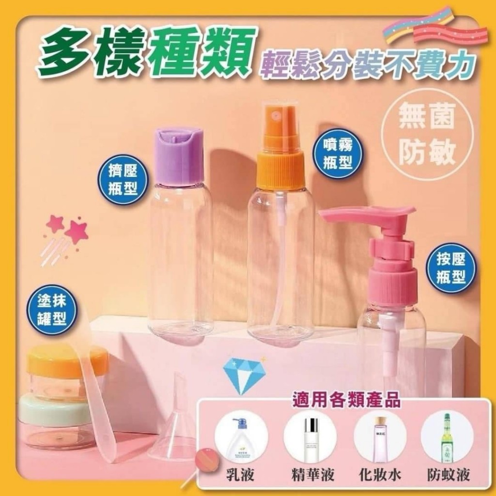 先說說外觀和包裝~ 收到貨的時候包裝很紮實,打開後一眼就被糖果色的瓶身戳中!不是那種廉價的塑料感,顏色鮮亮又柔和,粉粉嫩嫩的超可愛,擺在一起就很有少女心,連收拾行李都變得有儀式感了✨ 整套是8件,每個瓶子都有獨立的小保護蓋,避免運輸過程中磨損,細節處還是很用心的。