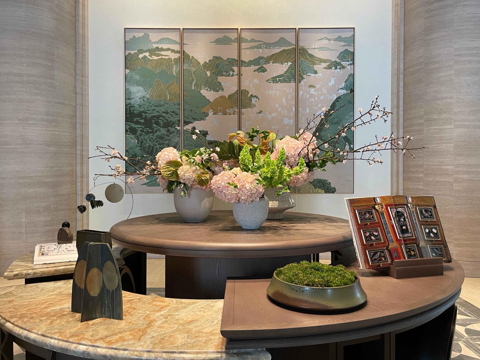 接待廳挑高而明亮,大量使用木石材料和花藝,牆上的四幅山水畫以現代手法描繪台北盆地,柔和燈光下,像是走進一位品味極好的朋友家的前廊。