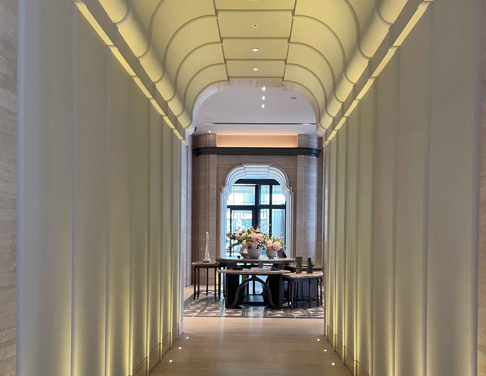 從接待廳通往大廳的通道,被設計成一條幽微的「隧道」。象徵性的轉場,讓人在短短幾步之間,彷彿從城市紛擾過渡到私人的靜謐領域。