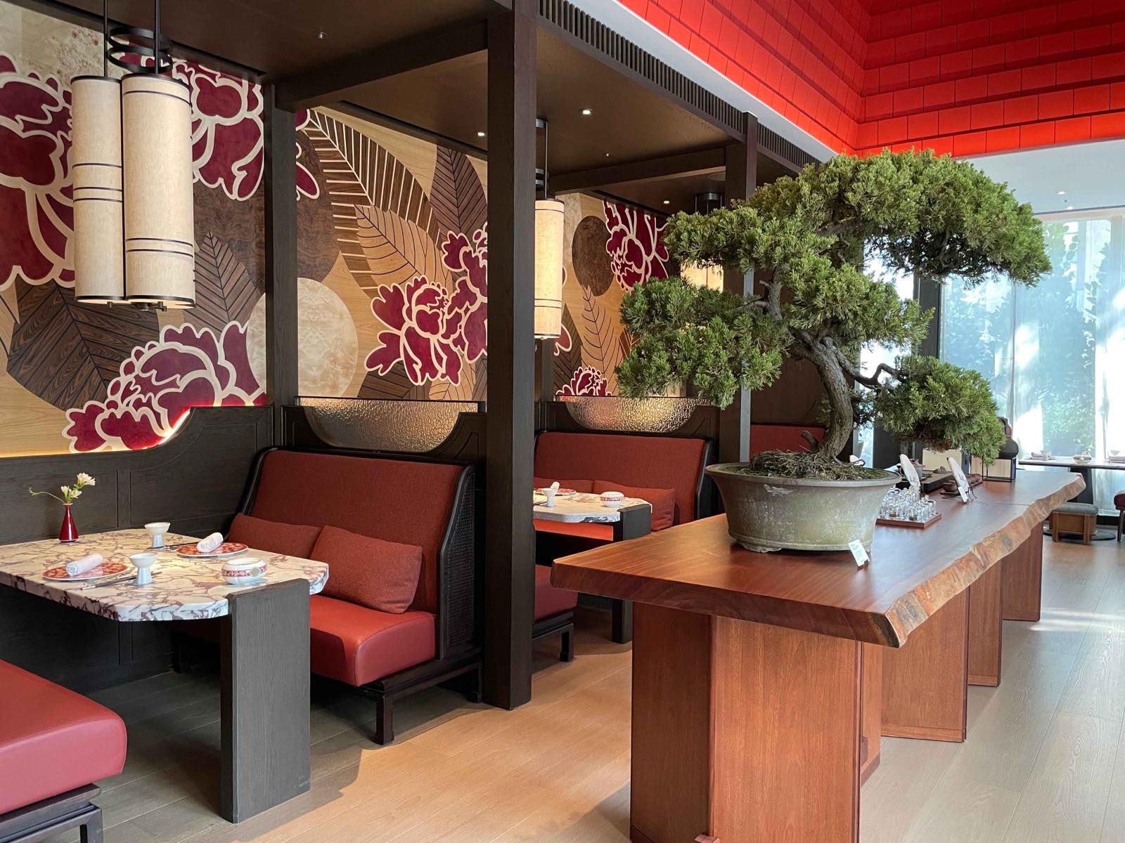 中式餐廳「榕居」取名自窗外那對雙生榕樹,象徵扎根於土地的深厚情感。室內以傳統紅屋瓦與牡丹牆為主視覺,金紅色系洋溢著富貴與吉祥的祝福。