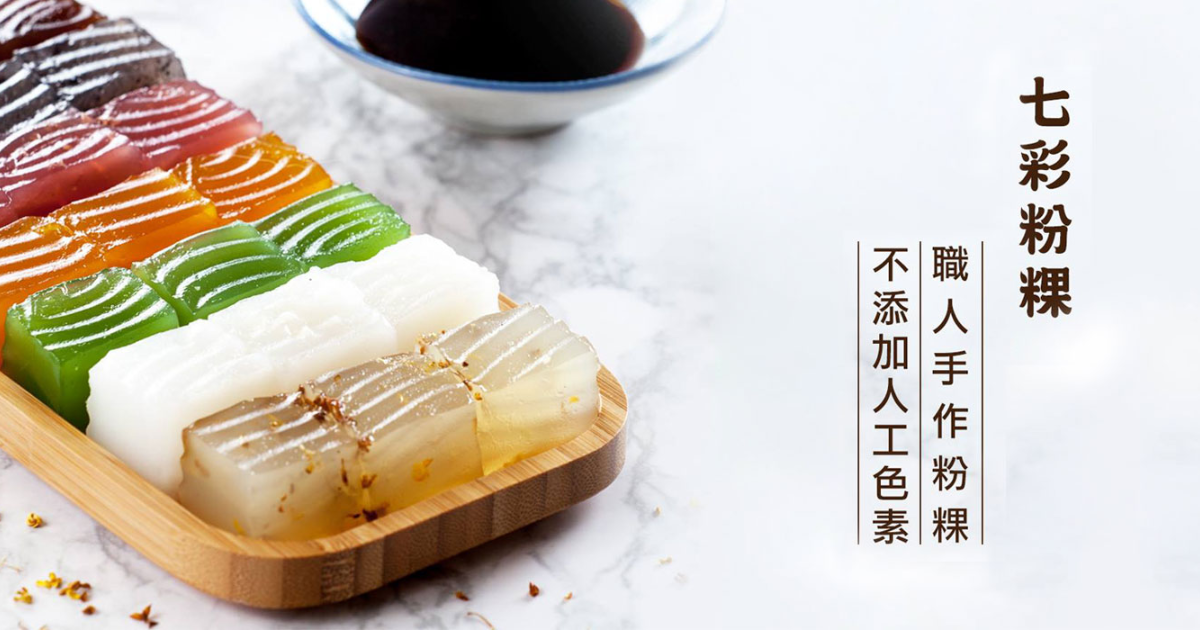七種不同顏色的粉粿超吸睛,分別為抹茶、芝麻、桂花、玫瑰、黑糖、原味跟椰香口味,下方是仙草凍